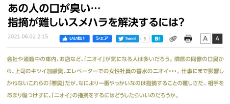「スメルハラスメント」といって、自分の口臭や体臭が知らないうちに他人に迷惑をかけていることで